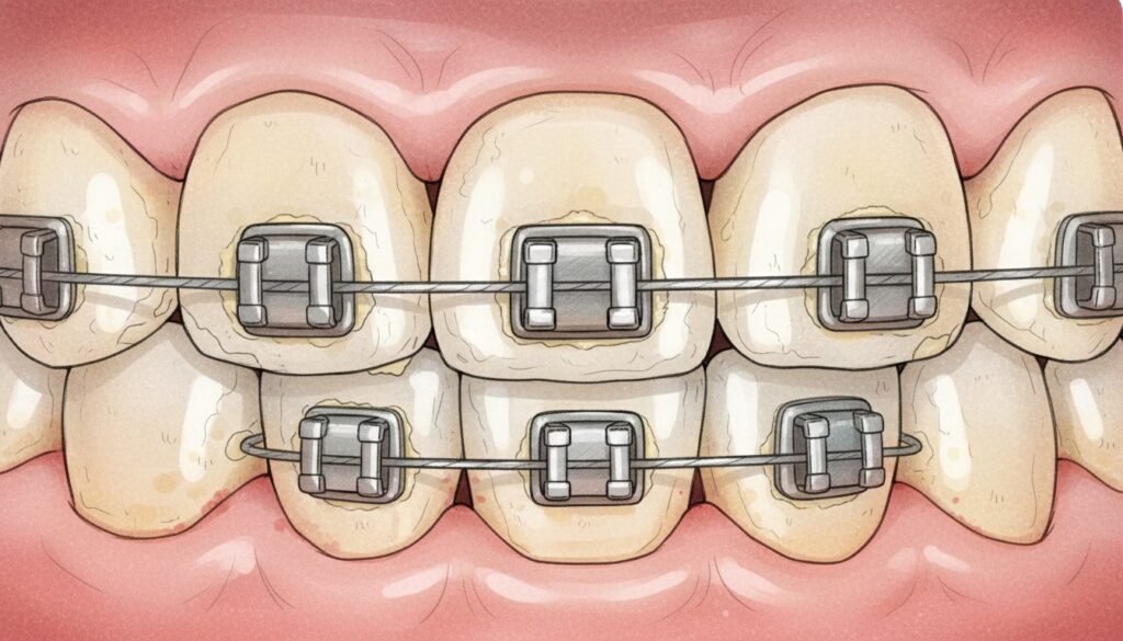 ブラケットとワイヤーの隙間、歯と装置の境目など、細かい部分に食べかすやプラークが残りやすいのです。こうした磨き残しは、虫歯菌や歯周病菌の格好の住処となり、放置すると深刻なトラブルや矯正装置の脱離につながります。