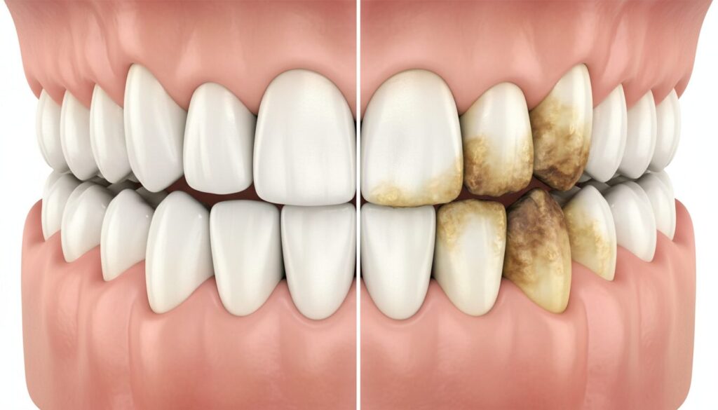 歯石は歯ブラシでは除去できず、歯科医院での専門的なクリーニングが必要になります。さらに、長期的に歯垢が付着している場合、歯肉に炎症を引き起こす歯肉炎となり、最終的には歯を支える骨を溶かしてしまう歯周病へと進行します。