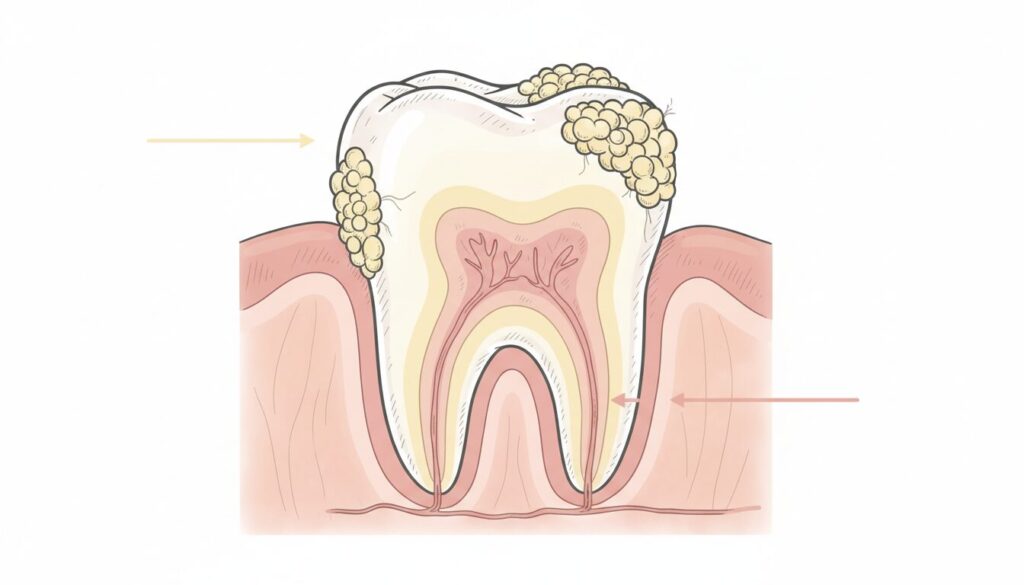 プラークが蓄積すると、細菌が糖を分解して酸を生成し、歯のエナメル質を溶かして虫歯を引き起こします。また、細菌が放出する毒素が歯ぐきに炎症を引き起こし、歯ぐきが腫れたり出血しやすくなったりします。歯肉炎から進行すると歯周病へと発展し、最終的には歯を支える骨を破壊する恐れがあります。