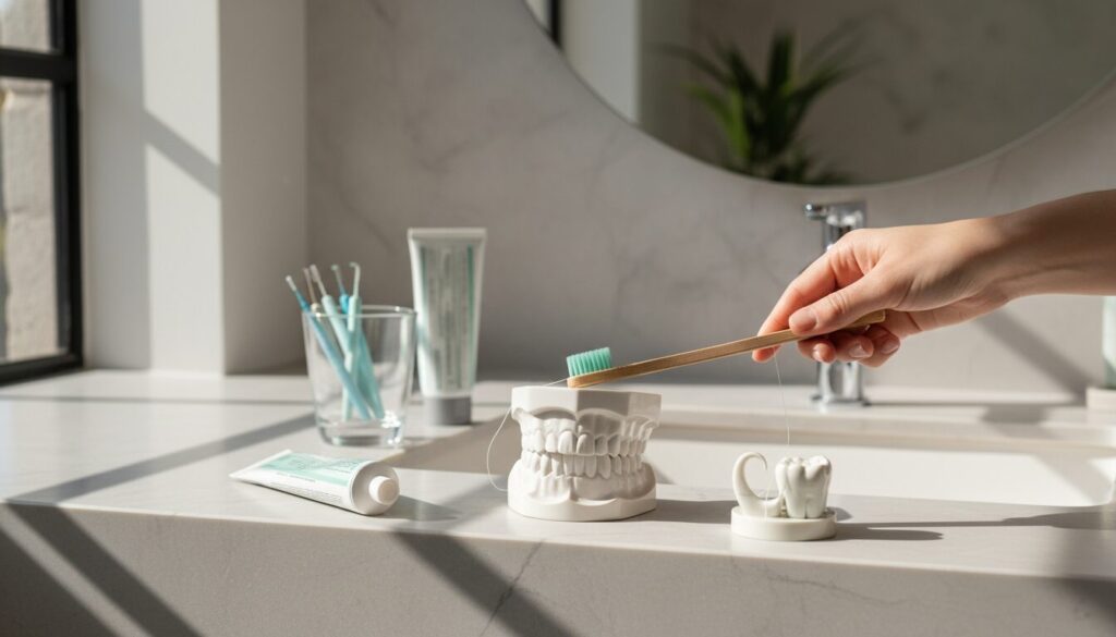 デンタルフロスや歯間ブラシを併用することで、歯間部のプラークを効果的に除去できます。デンタルフロスは、40cm程度の長さに切り、両手の中指に巻き付けて使用します。歯と歯の間にゆっくりと挿入し、歯の側面に沿わせながら上下に動かします。