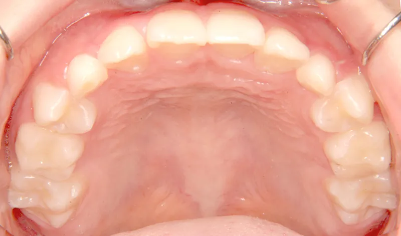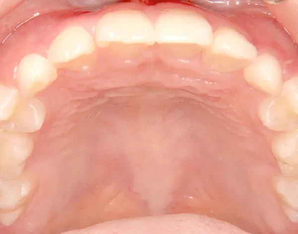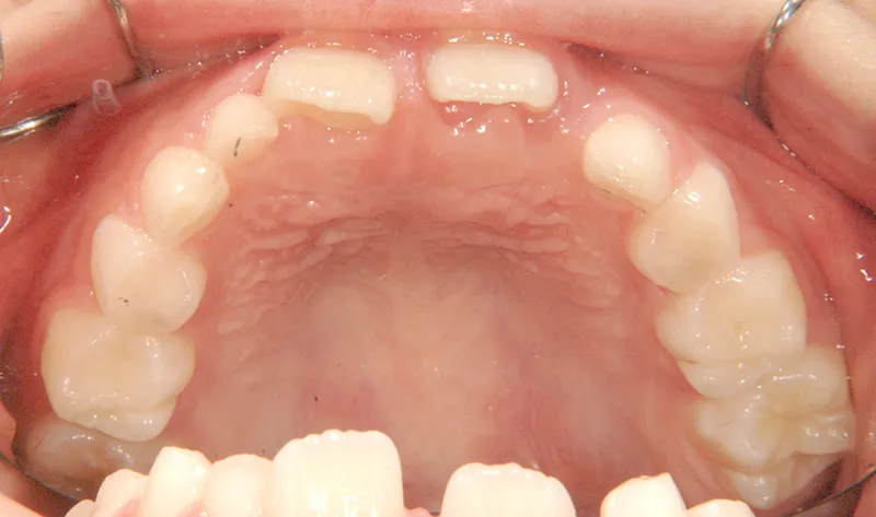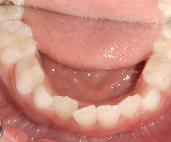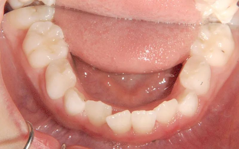 下の歯は永久歯の生えるスペースがないので、オリジナル矯正装置で受け口を治して、永久歯の生えるスペースを作りました。