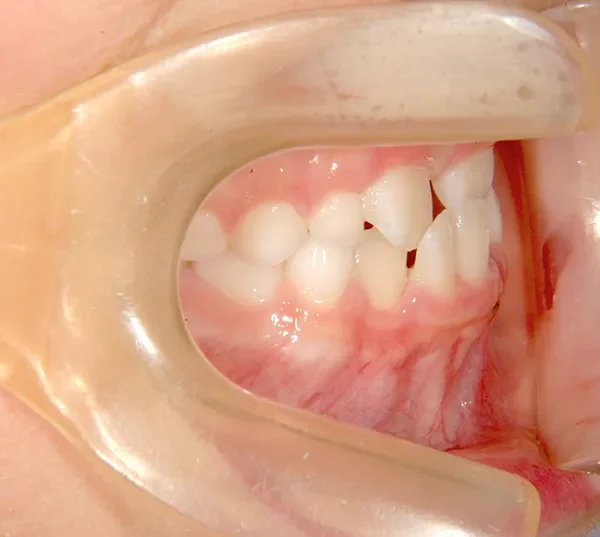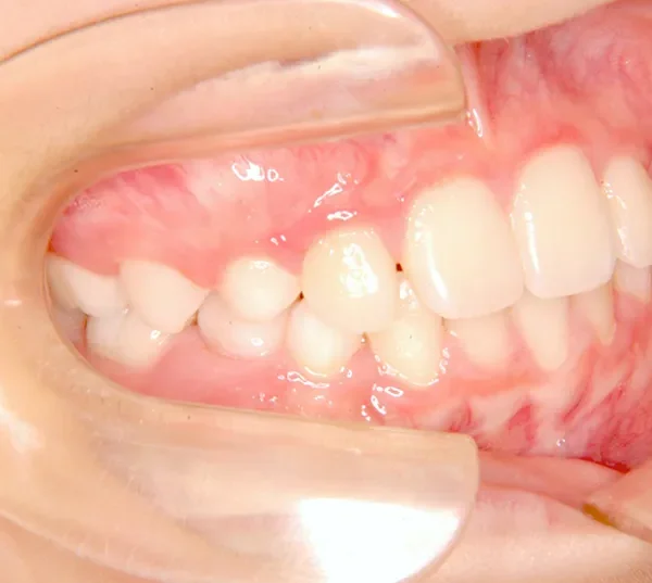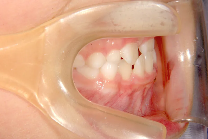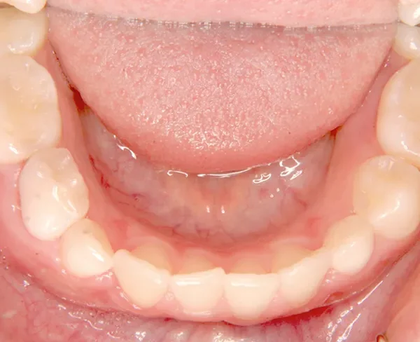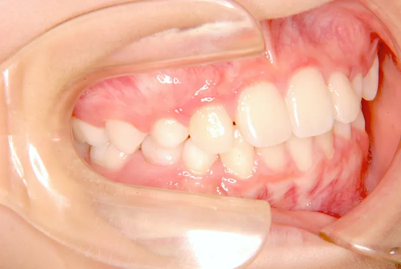 上の前歯が下の前歯より後ろに入って、受け口になっています。