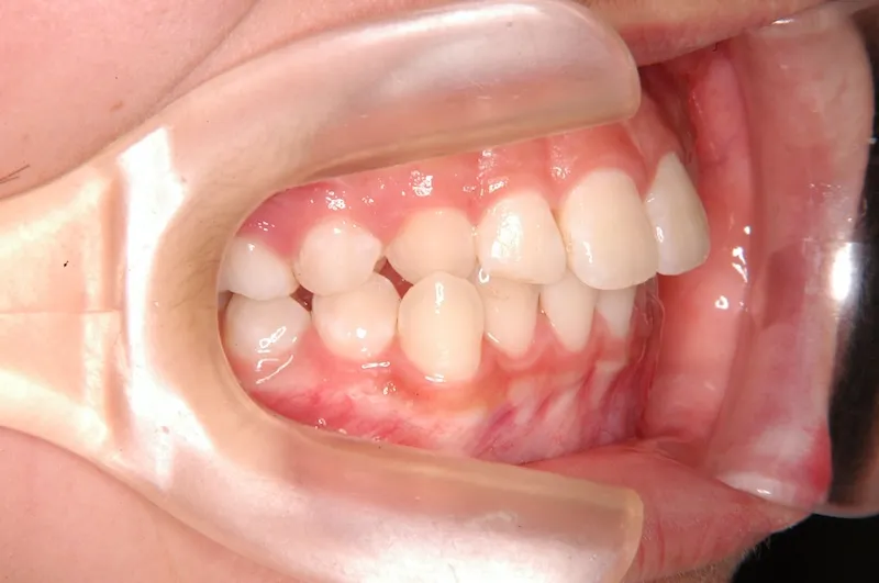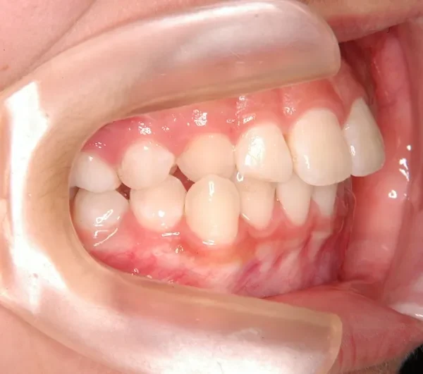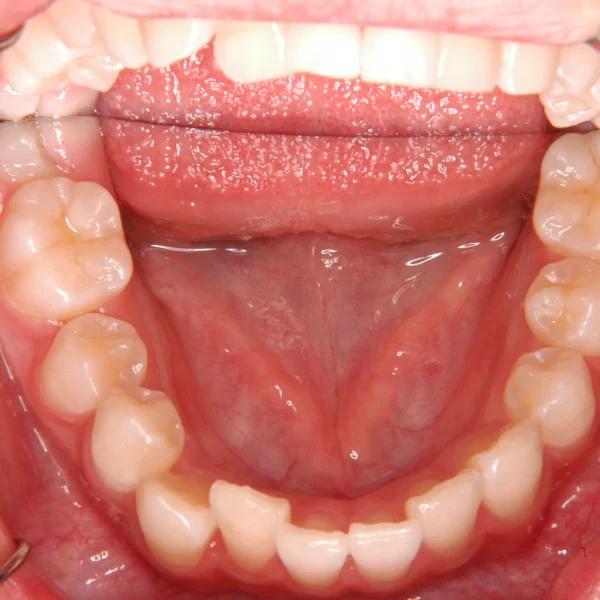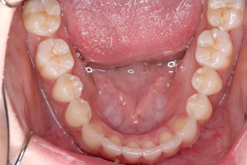 右下の犬歯がずれて生え噛み合わせの邪魔をしています。