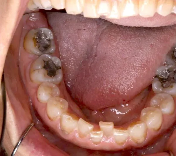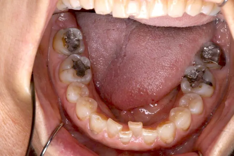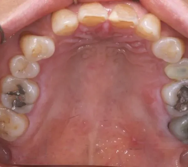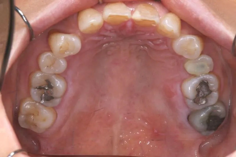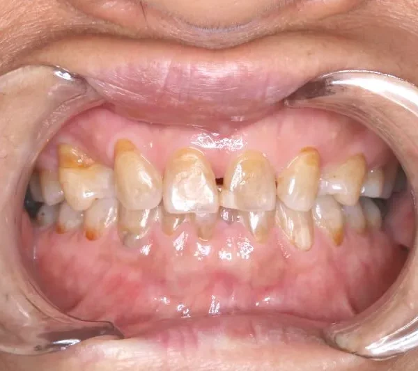 上の歯が2本足りないため上下のアーチが合わず、下の歯がガタガタになっています。